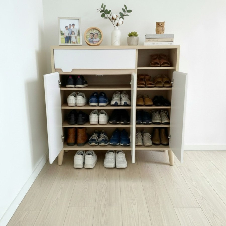 - Ample Storage: 3 doors for varied shoe sizes plus a functional top drawer.