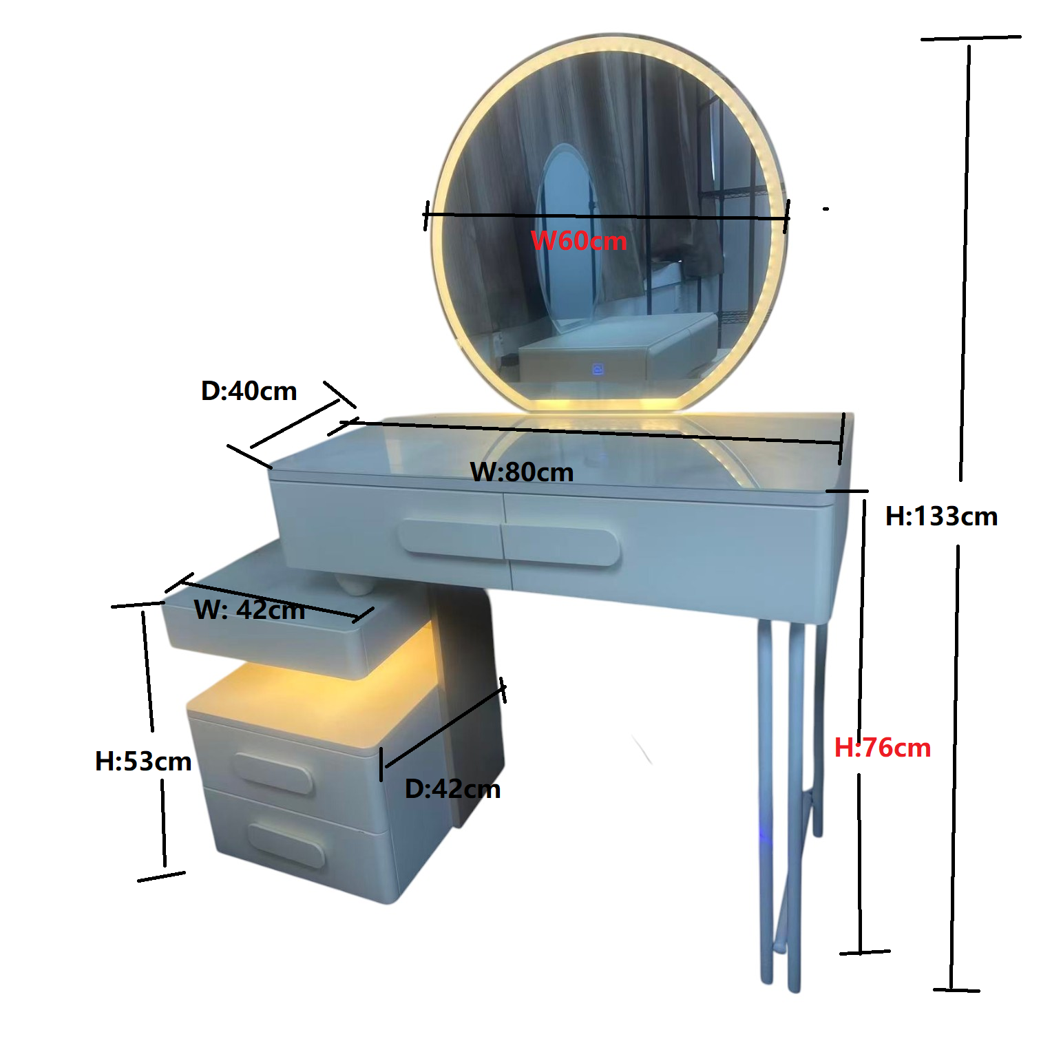 The illuminated round mirror enhances visibility for makeup application while adding a luxurious touch to your interior. The smooth glass top is not only stylish but also easy to clean and maintain, ideal for everyday use.