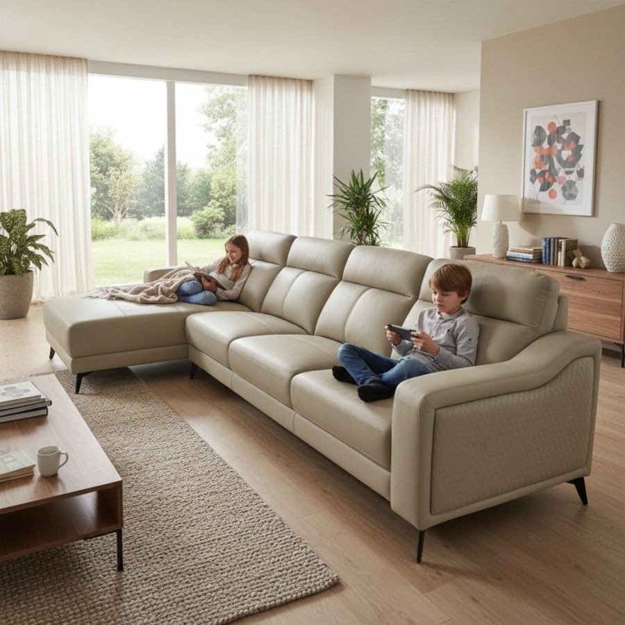 Transform your living space with this elegant L-shape corner sofa with chaise, designed for modern New Zealand homes. Upholstered in a soft light beige breathable fabric, this sofa brings warmth, comfort, and a clean minimalist aesthetic—perfect for Auckland apartments, family homes, or open-plan living areas.