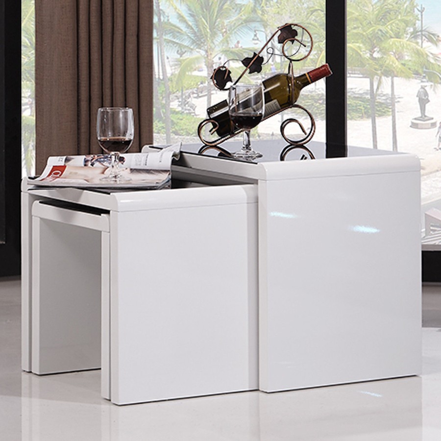 Black glass top with high gloss nest of table .