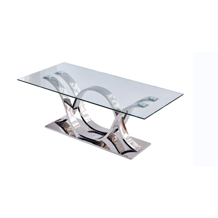 Featuring a stainless steel interlocking base that has been topped with a strong tempered glass table top.