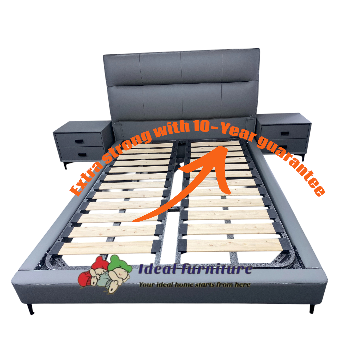 Our stylish and sophisticated leather bed frame perfectly blends modern design with enduring comfort, making it a perfect addition to your bedroom. This stunning bed frame features a genuine leather headboard with sleek, clean lines, offering a luxuriously comfortable backrest ideal for reading or relaxing. The dark gray leather upholstery adds a touch of sophistication and elegance, making it a versatile addition to any bedroom décor.