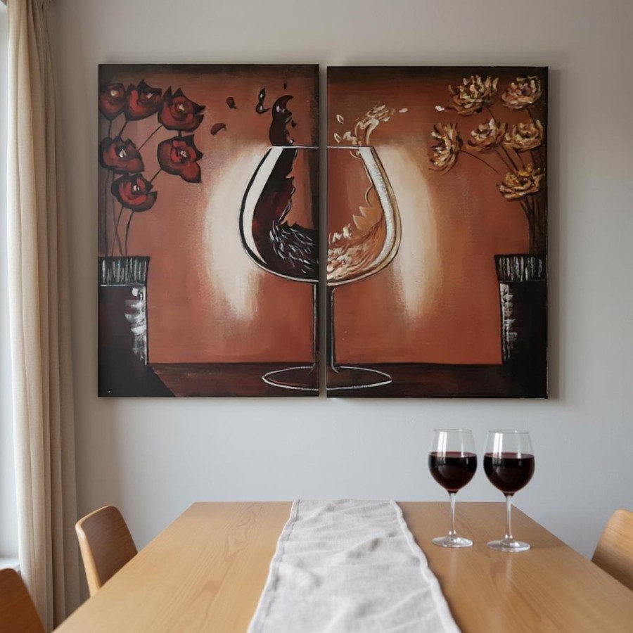 This 2-piece wine glass oil painting is hand-painted and suitable for living rooms, dining rooms, bars, winery