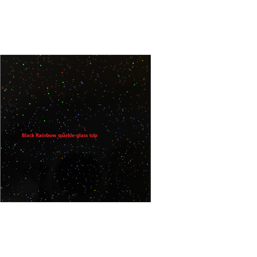 The chesterfield style ottoman coffee table with exter rainbow sparkle black glass top .