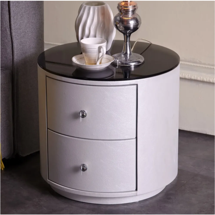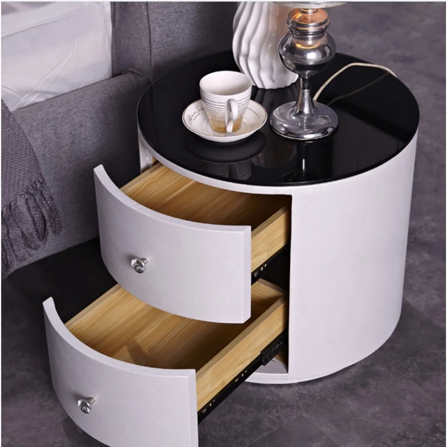 Modern style round side table . Featuring the round shape design and the faux leather upholstery, this nightstand delivers a touch of Nordic and modern charm.